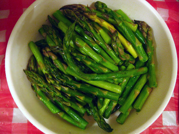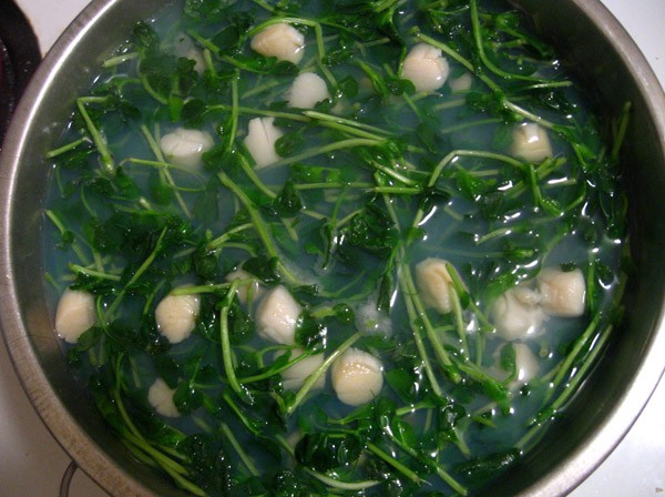 但是饭还是要吃的, 也只好强忍悲伤翻出昨天买的芦笋和上周剩的小豆苗来. 芦笋们下面一截切了跟香肠炒了, 上面一截用黄油蒸了. 可惜的是黄油不知是不是也放太久, 蒸出来竟然一点香味也没有. 但是今天火候把握的不错, 锅里没积水, 而且芦笋正好熟了, 咬下去嫩嫩的, 脆脆的, 还有点清甜的味道. 看来还是新鲜蔬菜好吃. 小豆苗和带子们(scallop)打了一锅汤, 味道十分鲜美. 高高兴兴地照了几张. 其实最漂亮的分明应该是芦笋炒香肠, 鲜红和嫩绿相映衬的, 可是灯光太暗, 照出来却黑糊糊的好伤心, 只好不放照片了.