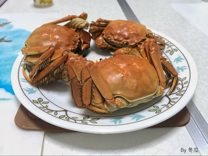 到家后如何发现有一位螃蟹小姐因不堪旅途颠簸已经香消玉殒不提,如何泡了一下螃蟹就烧水下锅蒸了20来分钟至鲜香四溢也略过不提,总之晚饭就是吃的如图的两公一母三只螃蟹加一碗白粥(现在已经又饿得肚子咕咕叫), 耗时足足一小时多。主要感想是螃蟹虽然鲜美,但除非有人帮忙剥壳处理, 否则十年吃一次也就差不多了。