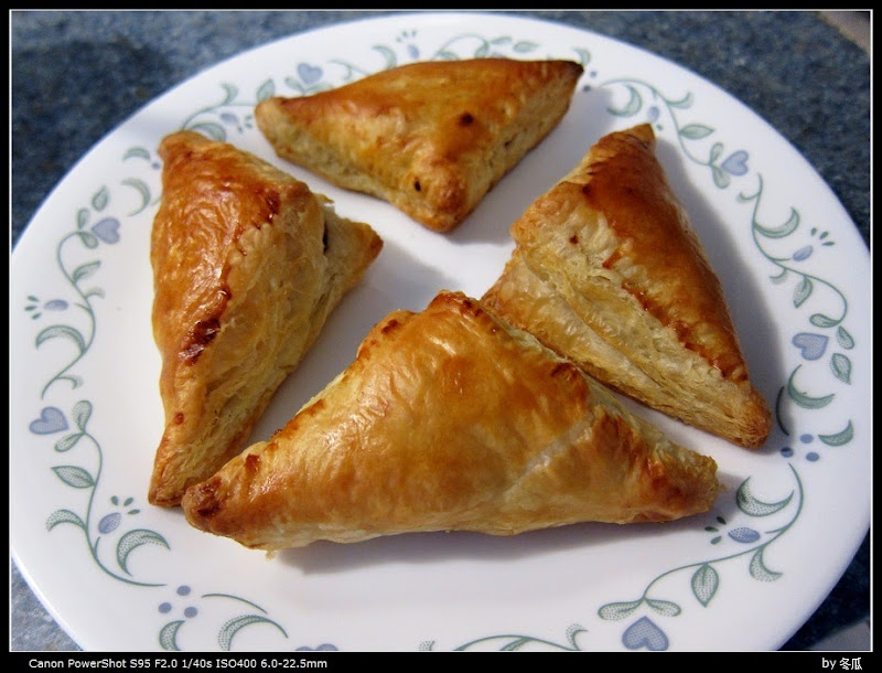 解冻puff pastry(从超市冷冻甜品的section直接买现成的, 解冻20分钟)之外, 制作过程只要5分钟且基本木有技术难度, 然后丢进烤箱烤10分钟出头即可. 真是十分简易.