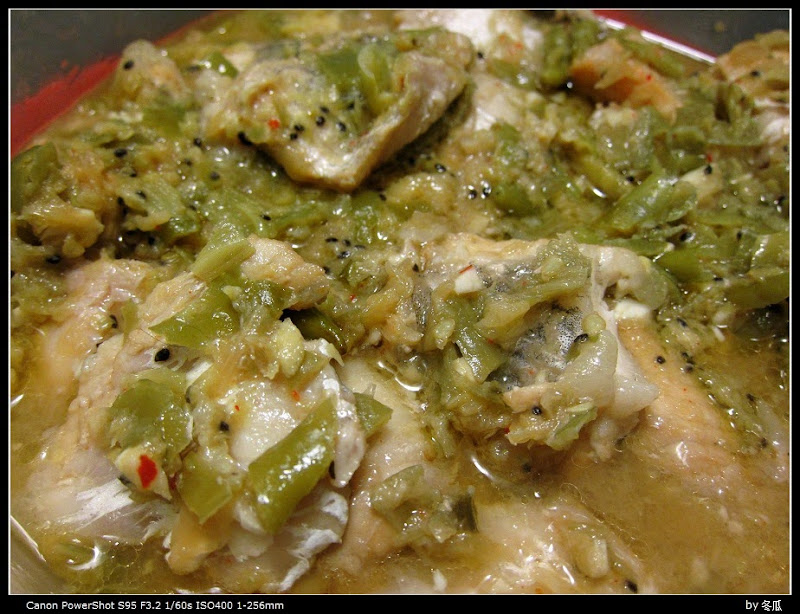 话说我n年前在这边的超市里买了一瓶土耳其的pickled pepper. 接着就像我冰箱里很多美好的东西一样…它森森地被我遗忘了. 前几天买了一包catfish鱼块, 翻冰箱的时候又看到了它. 突然觉得既然这细长青黄的腌辣椒长得跟俺们的野山椒颇有类似之处, 又都是腌出来的风味应该也相近, 也许能拿它做一做什么野山椒鱼片之类的菜. 后来搜菜谱不知怎么又搜到了剁椒鱼头, 就决定综合一下, 做一盘剁野山椒鱼好了. 尝了尝这瓶腌辣椒后感觉确实和野山椒颇有类似之处, 但口感有点单调没啥层次, 辣味, 咸味有余, 而酸味, 风味不足. 于是后来调味时多加了几滴lime juice, 还在搅碎辣椒时加了一个猕猴桃, 结果发现拌出来的味道正好, 酸辣里还透着一丝鲜甜, 倒是意外之喜. 做法是看了网上一些菜谱后再随便发挥底, 大致如下: 用料酒, lime/lemon juice和盐略腌一下鱼块/片, 大概20分钟; 然后切一点姜, 蒜, 和一堆腌辣椒一起剁碎(我还加了个猕猴桃, 另外是偷懒用小chopper搅的, 所以搅的不太碎看相不美丽, 不过差不多混合好就行啦)后铺到鱼块上. 然后水烧沸后一起进锅蒸. 据说剁椒鱼蒸的时候是不用放蒸鱼豉汁的, 保持原味鲜香. 不过我怕鱼入味不够, 虽然家里木有蒸鱼豉汁, 还是淋上了自己调的汁再蒸的. 汁是随便调的, 用一点耗油, 一点生抽, 一点白糖, 两滴lime juice, 加一点点水和油调开(还随手洒了一点点蒜粉), 尝尝自己觉得味道合适就淋到鱼上了. 大概蒸十分钟后就差不多了, 关火后还闷了两分钟以防万一. 最后每个菜谱里都说要”浇上热油”, 我也不大懂为啥子, 但是懒得另外点火烧油, 就弄了几勺橄榄油用微波炉热了一番(…)然后浇上蒸好的鱼以作为心理安慰. 最后出来大概算不上好看吧, 青糊糊的一片. 不过拨开辣椒夹了点鱼肉蘸一蘸汁吃, 味道真是太好了! 真的可以媲美印象中那酸辣鲜香的剁椒鱼味道! 而且超级下饭. 做起来其实也怪简单的, 看来以后还可以多做.