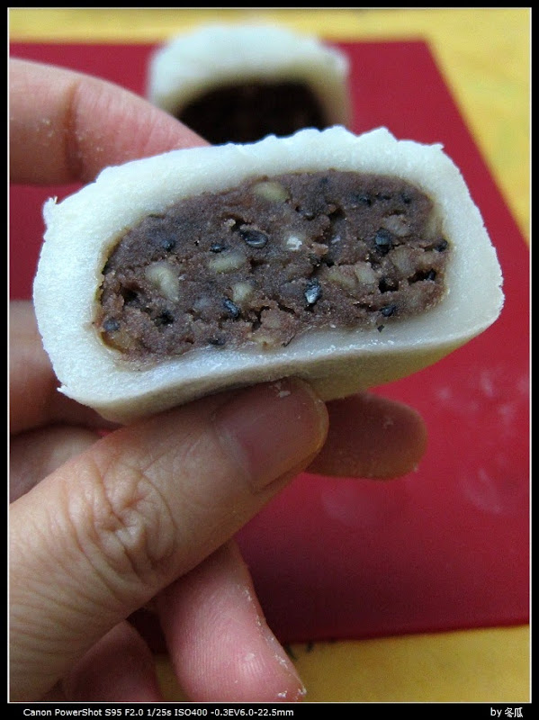 但我犯了一个极其xxoo的错误…因为家里从来不买牛奶, 所以习惯性地拿heavy cream替代了. 但是这玩意基本全是fat, 然后我蒸的时间长了点, 最后出锅一看, 好似蒸出了一团浸在油中的蜂窝状发糕. 那些油不知肿么的好像都析出来了, 即使把碗里的油全部逼掉, 最后弄出来的面团也是油光噌亮, 完全没有粘手的问题, 还几乎捏不拢@_@ 好在包好后再扑点糕粉似乎就正常了, 刚才冷藏了一阵战战兢兢拿出来吃了一个味道也很正常, 皮尤其好吃.