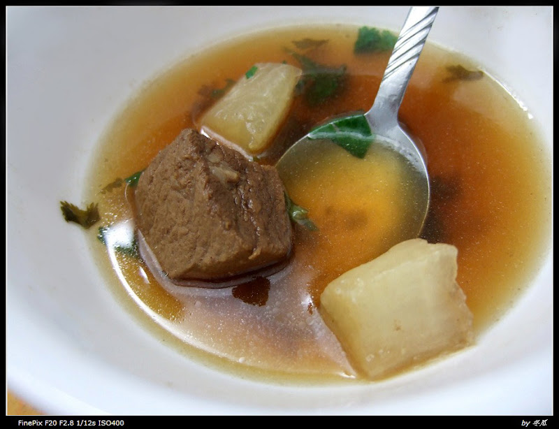 正好饿的肚子咕咕乱叫, 于是就盛了一碗吃了, 真是有史以来最好吃的宵夜啊. 汤鲜微辣, 牛肉块颜色微红, 咬起来一点也没有煮的过久后的那种干硬~ 萝卜也炖的正好, 不老不过, 味道正透进去. 实在太好吃了, 不得已再盛了一碗@_@ 一直到快吃完才想起来应该照个像留念一下(没照清楚)…于是…请忽略那半块萝卜上的隐约的牙印吧…