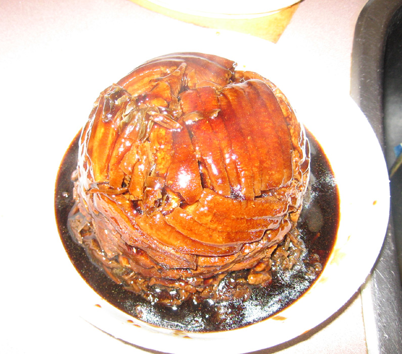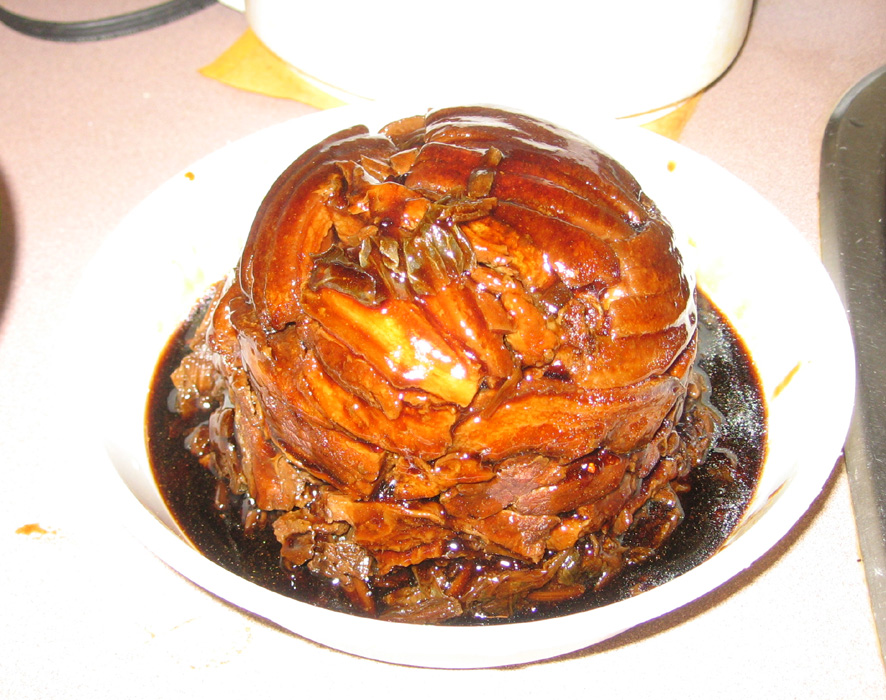 这…这次的看相不如上次, 原因主要是为了放进高压锅不得已用了一个深碗口, 筒形的碗蒸的, 所以看起来形状有点怪@_@ 而且肉肉是竖起来码的, 这样是方便汤汁渗透, 但是看起来就有点乱了…不过味道应该比上次更好 :> 然后…老抽似乎放多了, 好深的汤汁颜色~