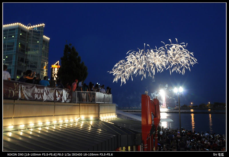 正当渐渐兴奋起来, 想尝试着换个更慢点的快门速度把光圈拨小点时…音乐声与烟花声戛然而止. 我还没反应过来, 发现身边的群众们不少已经干脆地转身掉头开始作退场状了. 一共15分钟不到的国庆焰火!我为此在102F的天气不辞劳苦地坐火车过来, 提前几小时在臭汗与滚滚的热气中饿着肚子干等…就这样完结了!真是太悲情了……