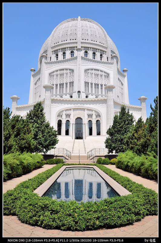 第二天103F, 破了历史上当天的百年高温记录. 我顶着烈日滴着油去了Chicago北边的Bahai Temple. 此信仰(Bahai)的大意是, 全世界宗教联合起来! 其创始人认为, 神只有一个, 在不同的宗教以不同的形式/身份显示. 于是基督教, 犹太教, 佛教…等等等等通通是一家.(其实听着还挺make sense的嘛…然而信此信仰则必须供奉其创始人, 那是什么道理?)全世界一共有7个庙, 这是其中之一.