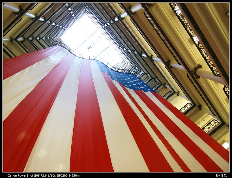 米国国庆那天我决定去Chicago看想象中的宏大焰火. 当天气温高达102F创了历史记录…朋友决定下午逛街, 尽量保持在室内有空调的地方活动. 在Macy里抬头一看, 巨大米国国旗悬挂头顶, 不知道是平时也挂还是专门为了国庆挂的.