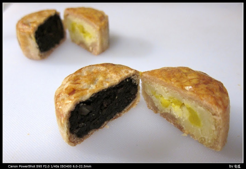 深色的是枣泥的, 浅色的是绿豆沙+咸蛋黄的. 蛋黄有点散一方面因为我用的是熟蛋黄, 另外馅本身太松散不好捏. 我还做了绿豆沙嵌葡萄干, 绿豆沙嵌印子, 枣泥嵌蛋黄的!