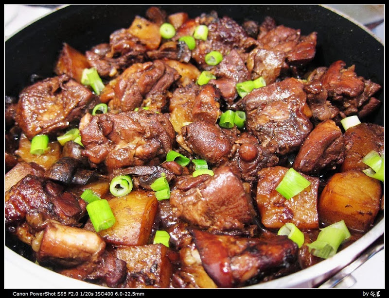 我本意是想做类似大盘鸡的东东, 但是奈何家里老抽太强力, 也没有面条垫底, 于是索性自由发挥出来一盘酱色的土豆蘑菇鸡块.