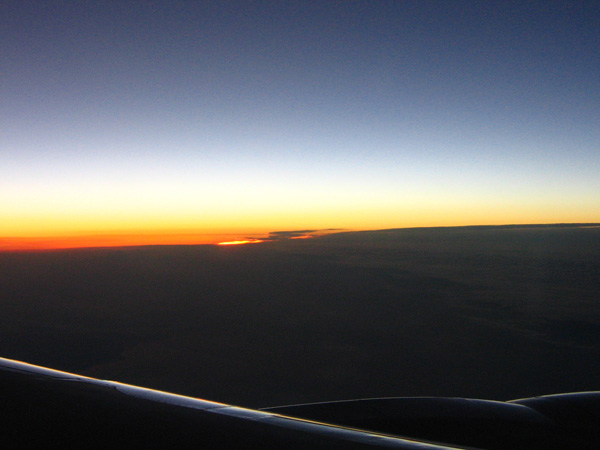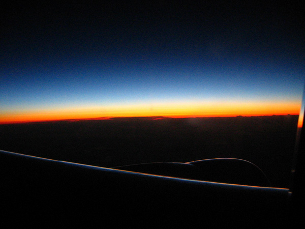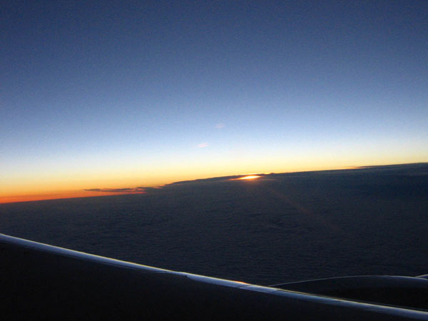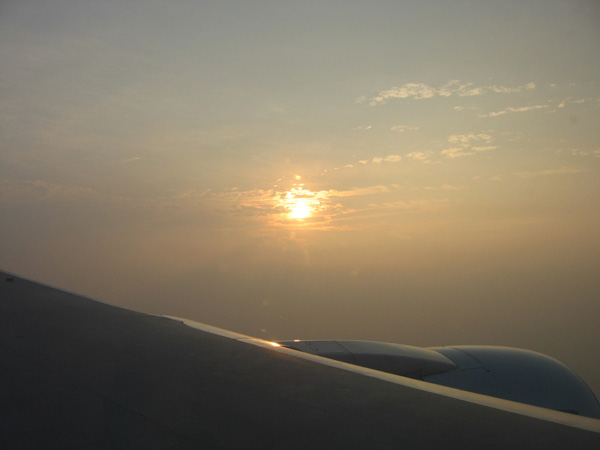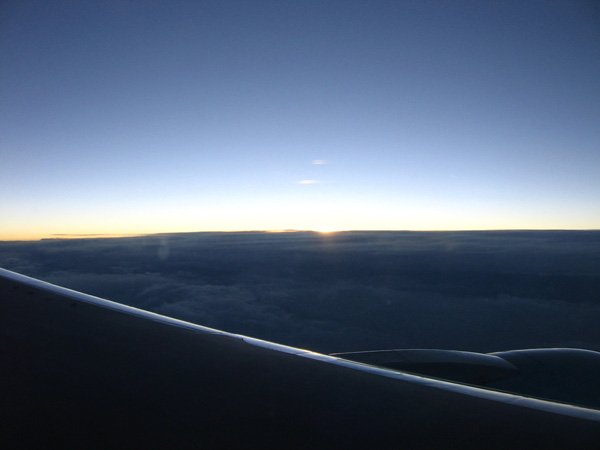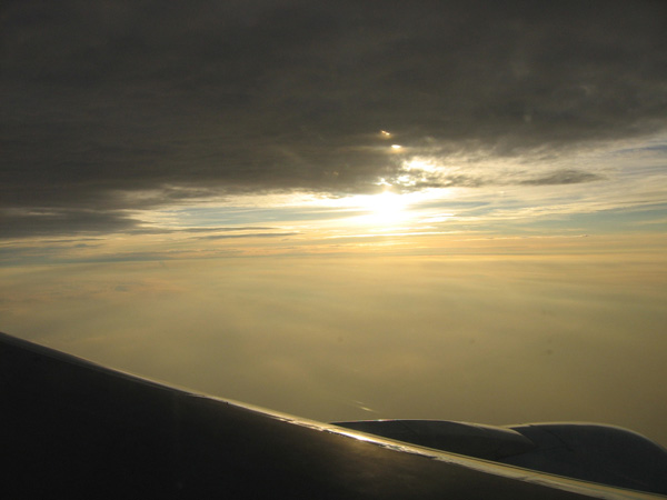 飞机上看日出飞机上看到的日出. 左下部分金属光泽的部分是飞机翅膀. 画面下半部分都是云层. |