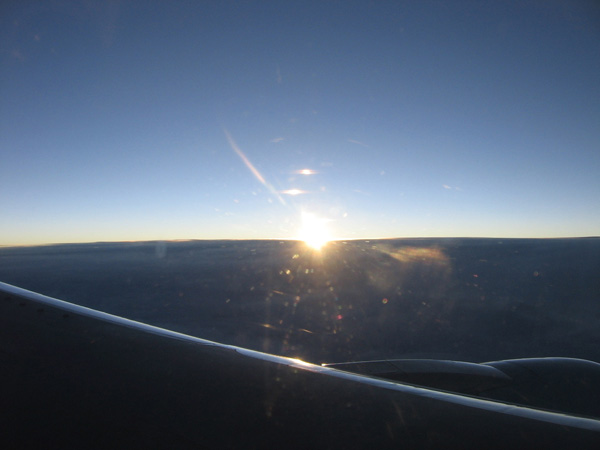 飞机上看到的日出. 左下部分金属光泽的部分是飞机翅膀. 画面下半部分都是云层.