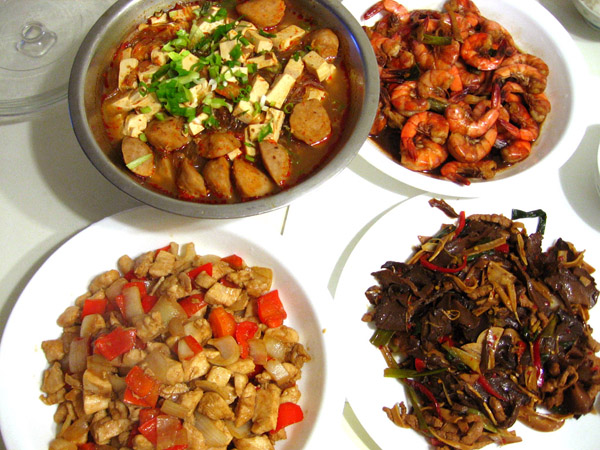 图中逆时针方向分别是豆腐锅, 油焖虾(?),烟笋炒肉(这是馅菜…)和洋葱辣椒鸡丁. 没有照进来的是梅菜煮肉(?)和呛黄瓜.( 颜色照的黑那是我水准问题, 当时这一桌还是十分娇艳可口的.)