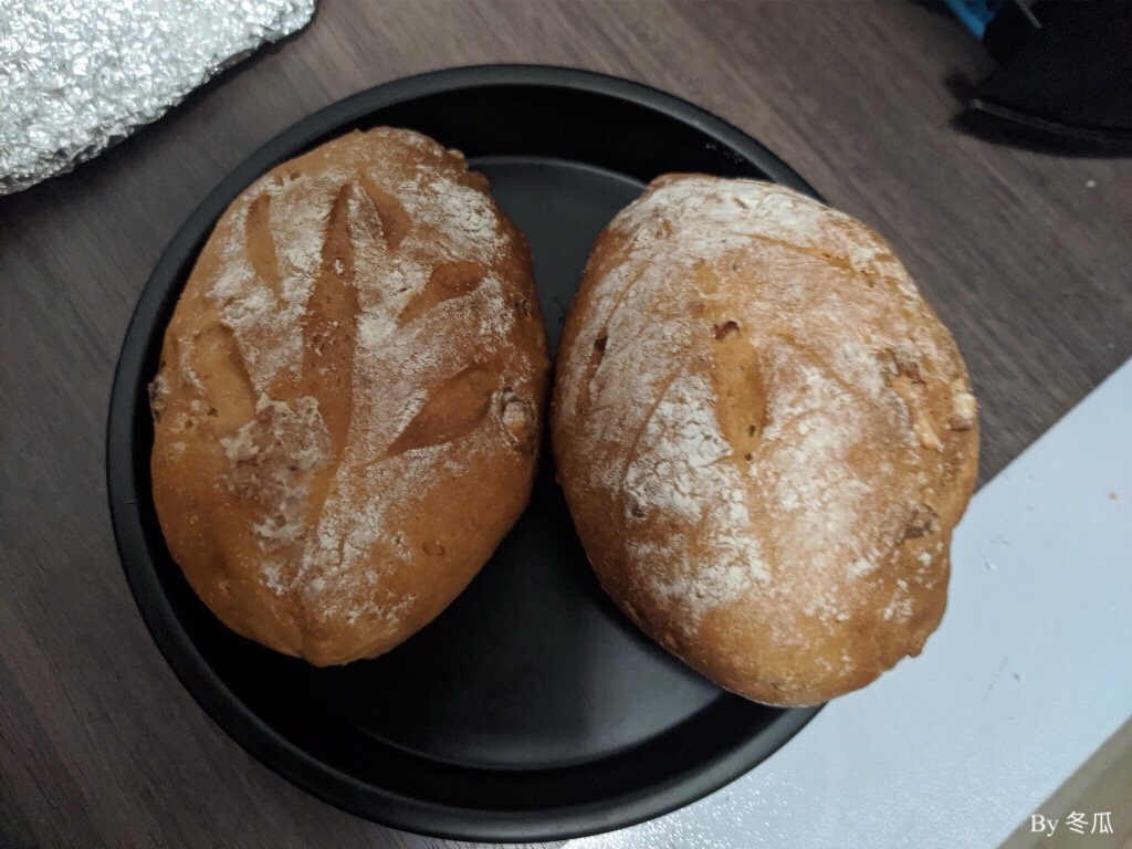 烤的过程中有两个没包严的面包果然露馅了,不过最后出炉时我还是挺开心的~麦香扑鼻,而且面上硬硬脆脆的,掰开里面很软。