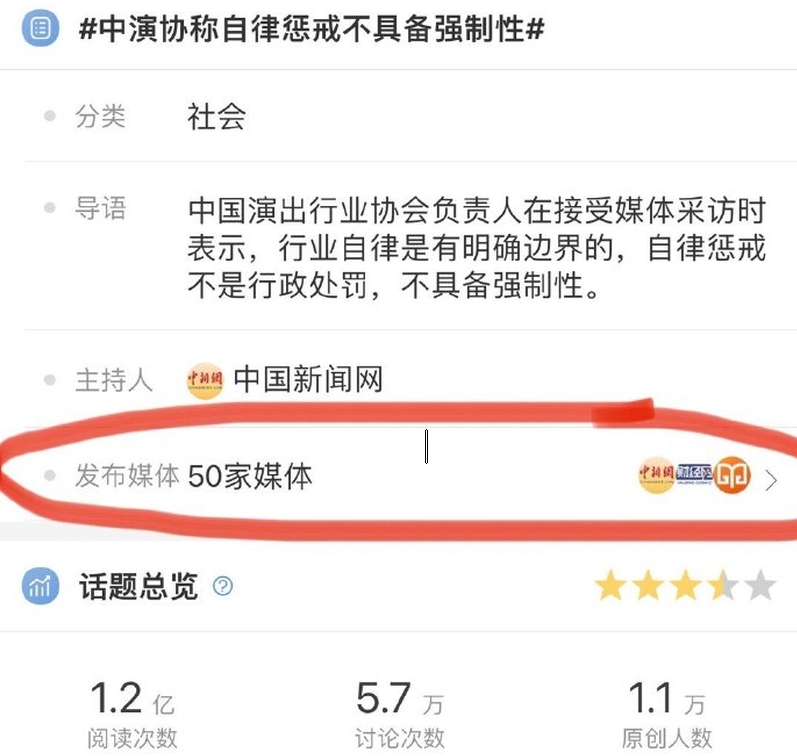 而“中演协”此声明一出, 大有“号令天下,莫敢不从”的威风架势:包括“中国新闻网”,“财经网”,“头条新闻”等在内的50多家微博“蓝V”媒体账号(以及大量微博营销号)几乎立刻在同一时间齐齐发布新闻通稿,为其背书之意明显;其中微博该话题的主持人“中国新闻网”及其它数家媒体,更是早在“中演协”官方正式发布声明之前近20分钟就已发出相关新闻通稿,可谓时效性惊人。