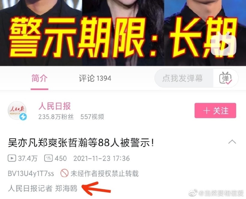 不仅如此,这位郑海鸥记者也和白瀛记者一样,致力于光速在全网最大限度地推广“中演协”的《名单》的效力:仅仅半小时后,该记者又已神速制作完成了相关视频,通过人民日报官方账号在b站发布。