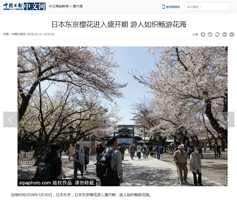 有趣的是,就在《中国日报》的官方网站上,2018年3月31日一篇题为“日本东京樱花进入盛开期 游人如织畅游花海“的报道下,一张大照片正中间,赫然是靖国神社的标志性主体建筑——“拜殿” —— 正面入镜。