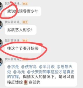 在“中演协”《名单》发布后,她立刻为其摇旗呐喊,发表了题为“岂能容忍‘饭圈’控制舆论走向”的署名文章。文中直接引用 “中演协”表演(直播)分会秘书长瞿涛的原话来表达观点,盛赞民间协会“中演协”的无证执法行为是“面对畸形‘饭圈’,行业主管部门 连出重拳”,并号召“各界携手发力”,“将主管部门 的动作传播到位”。从标题到内容,其因自己之前以官方账号传谣而受到“畸形饭圈”质疑的愤懑之情与助“中演协”立威之心可谓溢于言表了。