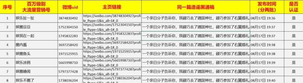 比如,仅在8月17日晚和18日上午共约三个半小时的两个时段,就至少有55名百万级流量的微博营销号集中发布了同一篇527字长、以吟唱式方式复述以下内容以加深读者印象的“谴责”通稿:“一个亲日分子告诉你,我碰巧去了靖国神社,碰巧参加了右翼婚礼,又碰巧在婚礼上致辞,再碰巧婚礼上有个臭名昭著的右翼反华夫人……”