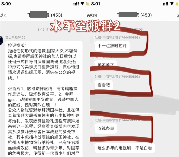 在一个当时有291名成员,名为“一天一杯奶茶钱“的水军群录屏截图中,可以看到有人发布任务后一呼百应的景象,和此后完成任务的成员回来汇报的盛况:当一个任务“圆满”地得到完成后,任务发布者一边亲切地询问“有没有宝做了多号的”,一边发出了名为“下架张哲瀚作品”的群红包奖励。