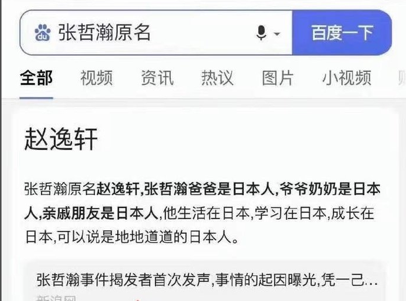 百度当仁不让,在事前先以其“百科”和搜索方面的“权威身份”预先提供好陷害张的伪证,为后续的谣言做好铺垫;此后更是肆无忌惮在百度搜索和百科内容中置顶显示谣言,称全家三代中国共产党员的张哲瀚是“地地道道的日本人”,为谣言的巨大化和推广立下汗马功劳。
