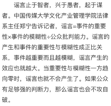 尤为讽刺的是,今年8月28日,韩丹东记者还发表了一篇题为“如何让网络谣言失去生存的土壤”的文章,文中引用了郑宁的话:“谣言=事件的重要性x事件的模糊性/公众批判能力”(见下图)。