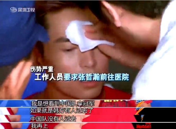 作为队伍顶梁柱的他为了每一轮中国队能获胜,可谓拼尽全力 —— 即使在比赛中出现意外、全力奔跑时从眉心到眼角下方猛烈撞击到摄像机而当场头破血流、造成脑震荡和需要缝合7针的伤口时,他也因为担心中国队会因人手不足失分而不愿离场去医院。